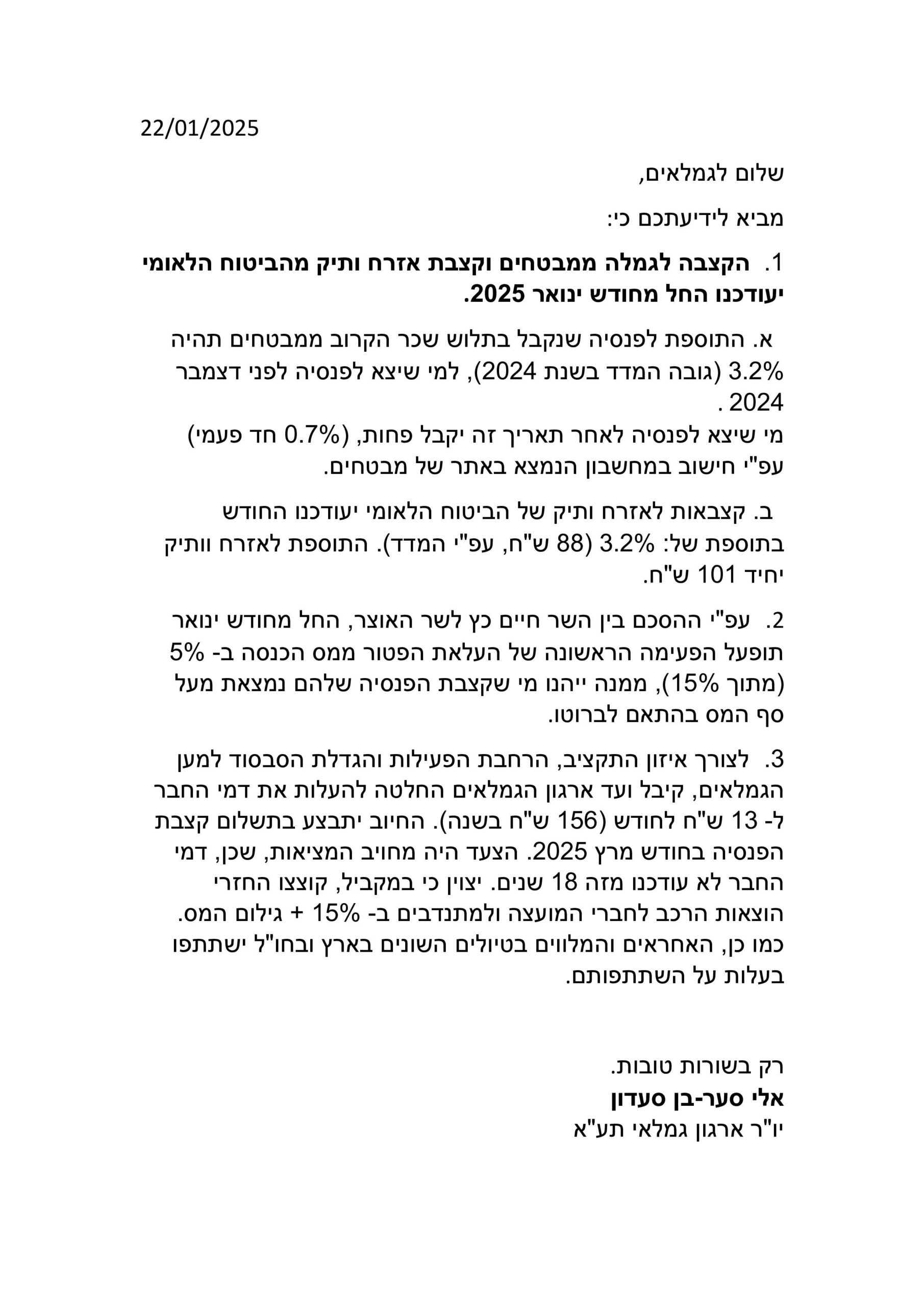 | 21/01/2025 | הודעת יו"ר הארגון בנושא השינויים בקצבאות ובדמי החבר לארגון | דף הבית |